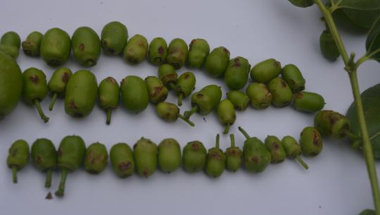 發(fā)病后期,棗吊發(fā)病部位失水,有的棗吊則出現(xiàn)斷裂,花蕾脫落。發(fā)生嚴重時花蕾較少甚至形不成花蕾,座果率顯著降低,甚至座不住果子。后期則棗吊干枯,棗吊上坐住的果實,由于營養(yǎng)不良,品質(zhì)受到很大影響.