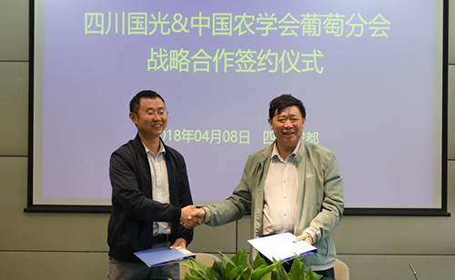 2018年4月8日,中國(guó)農(nóng)學(xué)會(huì)葡萄分會(huì)會(huì)長(zhǎng)劉俊、秘書(shū)長(zhǎng)張鶴蒞臨國(guó)光,與國(guó)光總經(jīng)理顏亞奇就葡萄產(chǎn)業(yè)現(xiàn)狀與種植技術(shù)變革進(jìn)行了交流,雙方在友好協(xié)商、互相促進(jìn)的前提下簽署了戰(zhàn)略合作協(xié)議,國(guó)光有幸成為了中國(guó)農(nóng)學(xué)會(huì)葡萄分會(huì)第一家戰(zhàn)略合作單位。