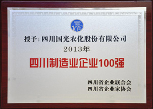 2013年11月19日,四川省企業(yè)聯(lián)合會、四川省企業(yè)家協(xié)會在成都金牛賓館召開2013四川企業(yè)100強(qiáng)、四川制造業(yè)企業(yè)100強(qiáng)、四川服務(wù)業(yè)企業(yè)50強(qiáng)發(fā)布暨企業(yè)發(fā)展峰會,四川國光農(nóng)化股份有限公司榮獲四川制造業(yè)企業(yè)100強(qiáng)。