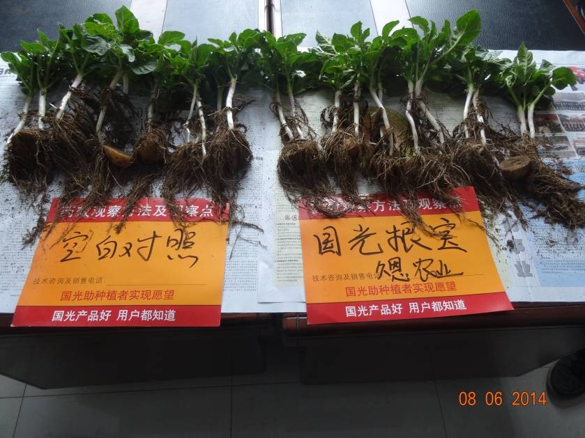 當(dāng)時(shí)將馬鈴薯根系取下并測(cè)量根系的數(shù)量,可以明顯發(fā)現(xiàn)使用國光根寶的根系數(shù)量大且比對(duì)照長,根系比較發(fā)達(dá)。而對(duì)照的根系比較短、少。