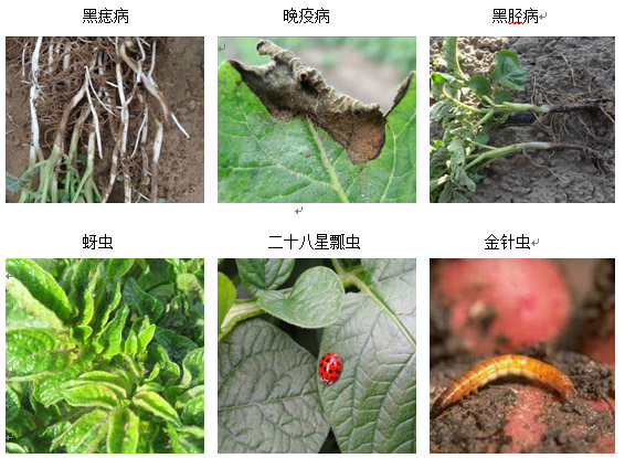 以預(yù)防為主,及時防治病蟲害。苗期——開花期的主要病害有黑痣病、早疫病、晚疫病、黑脛病、環(huán)腐病等。黑痣病近兩年在馬鈴薯上發(fā)生比較多,特別是在苗期地溫較低、濕度大的情況下易發(fā)生,嚴(yán)重影響馬鈴薯幼苗的生長。對于黑痣病可以在苗期(苗高10-20cm)使用30%噁霉靈水劑(如國光重茬寶)進行噴灌或滴灌,能有效控制黑痣病的發(fā)生。另外,如果連續(xù)一周以上的陰雨天氣,就容易發(fā)生晚疫病,對晚疫病要以預(yù)防為主,在出苗率達(dá)95%后用代森錳鋅、甲霜靈錳鋅進行預(yù)防,發(fā)病初期開始噴灑甲霜靈、霜脲氰、三乙膦酸鋁等藥劑隔7~10天1次,連續(xù)防治2~3次,也可以使用國光三治(50%錳鋅·氟嗎啉)80-107g/畝噴霧進行防治。對于早疫病可以使用百菌清、代森錳鋅等藥劑進行預(yù)防,在發(fā)病初期可以使用甲霜靈錳鋅、霜脲錳鋅、苯醚甲環(huán)唑等藥劑進行防治。對于黑脛病、環(huán)腐病等細(xì)菌性病害可以使用農(nóng)用鏈霉素、銅制劑等藥劑進行預(yù)防,若發(fā)現(xiàn)病株及時清除。此期馬鈴薯的主要害蟲有蚜蟲、28星瓢蟲、薊馬、跳甲、金針蟲、蠐螬、小地老虎。對于蚜蟲、薊馬可以使用吡蟲啉、啶蟲瞇等藥劑進行防治,對于瓢蟲、跳甲、地下害蟲等可以使用氯氰菊酯加上甲維鹽防治。
