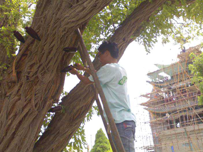 這兩棵古樹差不多有三層樓高,樹根盤枝錯節(jié),樹體朝一側(cè)傾斜著,被工作人員用鋼管支架精心支撐住。據(jù)了解,2013年,永寧縣林業(yè)局邀請自治區(qū)林業(yè)廳、銀川市園林局專家對這兩棵刺槐的樹齡進行鑒定,專家根據(jù)兩棵樹的高度、直徑,結合樹種的正常生長速度進行估算,結論是兩棵刺槐樹齡均已過百年。