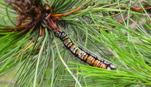 為害特點 以幼蟲群集取食松樹針葉,輕者常將松針食光,呈火燒狀,重者致使松樹生長極度衰弱,容易招引松墨天牛、松縱坑切梢小蠹、松白星象等蛀干害蟲的入侵,造成松樹大面積死亡。